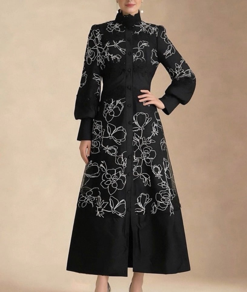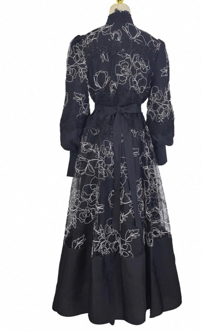 black flower desigh one piece ブラックフラワーデザインロングワンピース