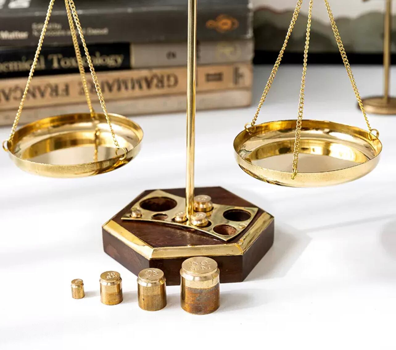 天秤デザインのゴールドのディスプレイ。